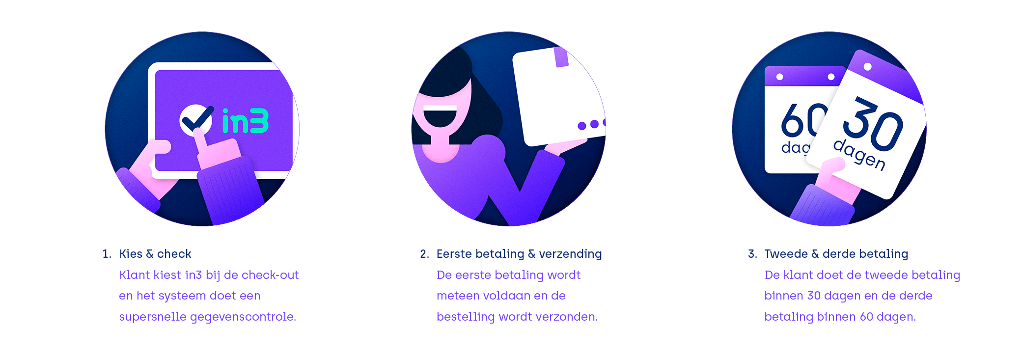 Als je kiest voor in3 betaal je het volledige bedrag in drie gelijke delen binnen 60 dagen. Op de dag van je bestelling betaal je het eerste deel via iDeal en wordt je aankoop verzonden. 30 dagen later betaal je het tweede deel en weer 30 dagen later het derde deel. Zo hoef je geen grote uitgave in één keer te doen. Je ontvangt een mailtje zodra je een nieuwe betaling moet doen. Wel zo makkelijk!